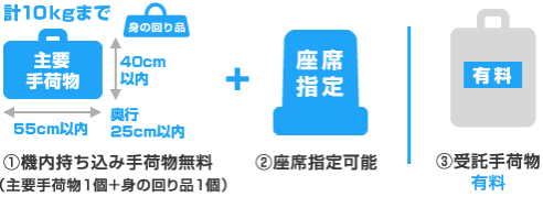 ①機内持ち込み手荷物1個と身の回り品1個、合計10kg以内の手荷物。
